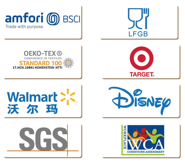 公司視產品質量如生命,始終堅持“以創新誠信求生存,以品種質量謀發展”的質量方針。公司先后通過ISO9001:2015質量管理體系認證、ISO14001:2015環境管理體系認證和知識產權管理認證;通過美國沃爾瑪驗廠、迪士尼驗廠、塔吉特驗廠及歐盟BSCI認證;產品通過歐洲Oeko-Tex standard 100生態紡織品1類(嬰幼兒)產品認證、WCA、SQP認證;產品通過SGS檢測及BV檢測,未發現增塑劑、雙酚A、福爾馬林等有害物質;有害重金屬及有害物質符合歐盟EN 71玩具安全標準,符合美國ASTM F963玩具標準;產品材料符合德國LFGB食品接觸材料管理法、歐盟Reach法規、ROHS指令的相關環保標準;抗靜電性能符合歐盟EN 1149抗靜電檢測標準。